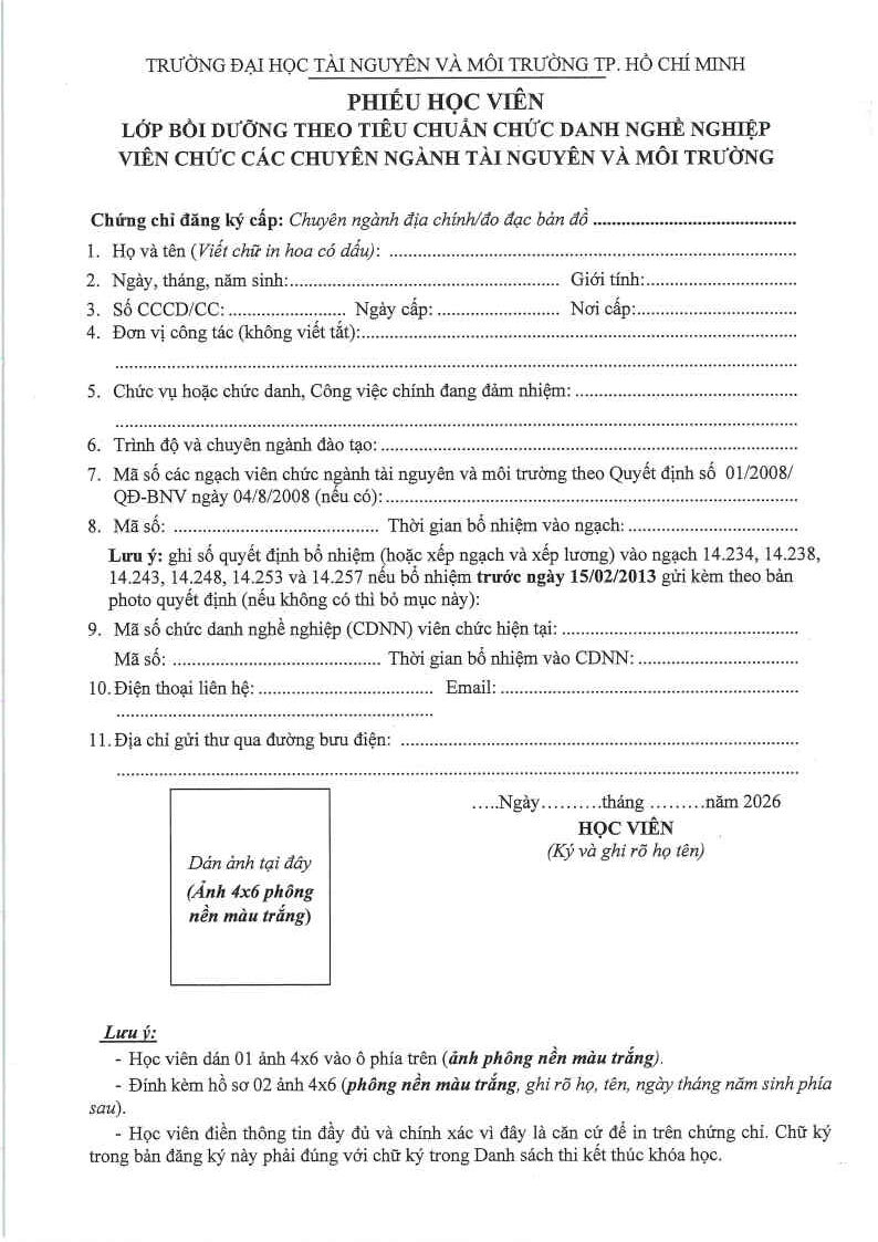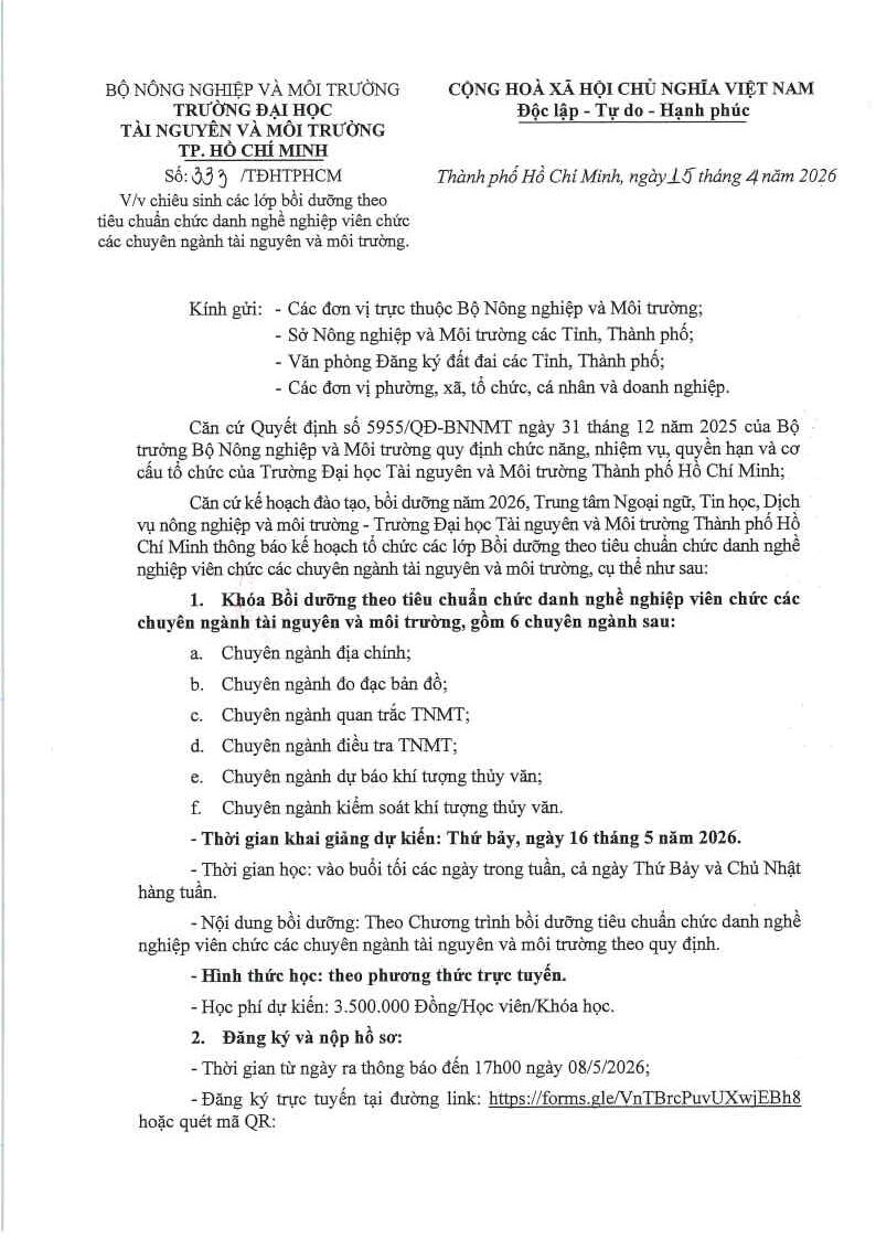 Thông báo chiêu sinh các lớp bồi dưỡng theo tiêu chuẩn chức danh nghề nghiệp viên chức các chuyên ngành tài nguyên và môi trường Ngày đăng: 17/04/2026 Chuyên mục: Thông tin tuyển sinh